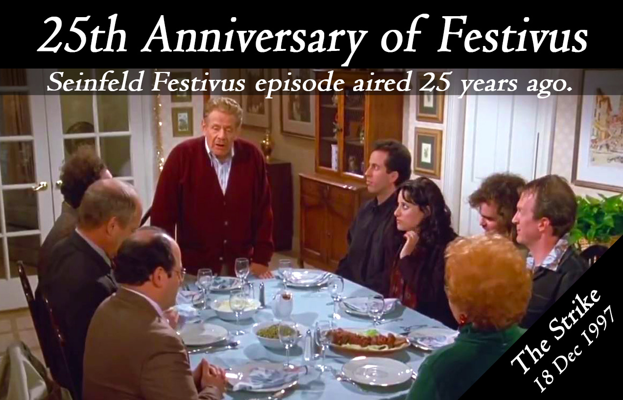 Web Festivus is an annual Dec. It is mainly meant as an alternative to the pressures and commercializtion of the Christmas season. Originally created by author Daniel OKeefe Festivus entered popular culture after it was made the focus of the 1997 Seinfeld episode The Strike which OKeefes son Dan OKeefe co-wrote.